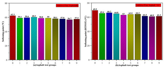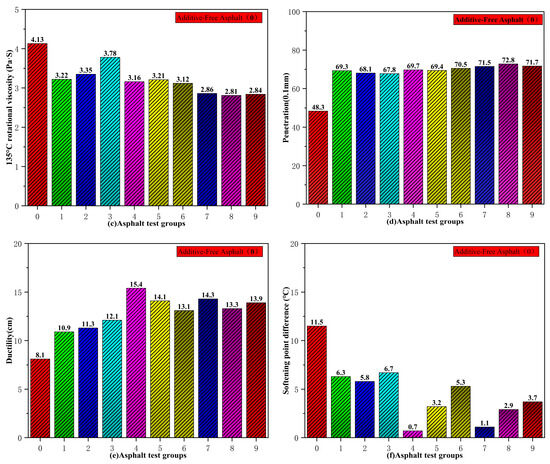 In this study, conventional physical property tests were conducted on the prepared additive-free asphalt and DR/EVACMA in 10 groups numbered from 0 to 9. The experimental results are shown in Figure 3.