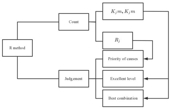 The range analysis method (R method), also known as intuitive analysis, is commonly used in the analysis of orthogonal tests, and the content of the method is shown in Figure 4.