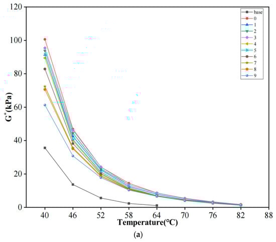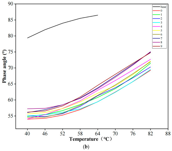 The asphalt rutting coefficient (G*/sinδ) is used in the SHRP specification to describe the rutting resistance of asphalt binders. In Figure 5a, the G* of the modified asphalt is much larger than that of the base asphalt, which indicates that the composite-modified asphalt with the addition of gum powder and EVA has an improved rigidity, resulting in better rutting resistance [7]. Meanwhile, the G* gradually decreases with an increasing temperature, indicating that the bearing capacity of asphalt is negatively correlated with temperature. However, it is worth noting that there are differences in the size of the G* of asphalt, which, intuitively, may be directly related to the content of FEO, with a higher G* for asphalt Samples 1, 2, and 3, which have the smallest amounts of FEO. One explanation is that FEO maintains the colloidal equilibrium of the asphalt, allowing the modifier to dissolve effectively and completely in the asphalt, but the significantly lower G* values for asphalt Samples 7, 8, and 9 are thought to be due to the excessive softening of the FEO, which leads to the softening of the asphalt and a large reduction in the resistance to load deformation.