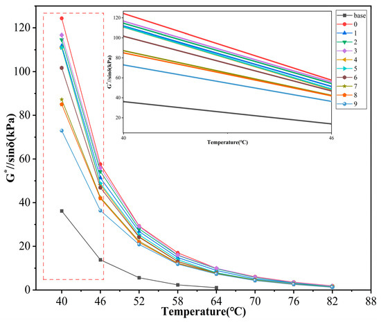 According to the SHRP specification, the G*/sinδ is derived from the G*, which represents the rutting resistance coefficient of asphalt binder. In Figure 6, the magnitude of the G*/sinδ for different binders is in the following order: matrix-modified asphalt (0) > orthogonal test group (1–9) > matrix asphalt. When the amount of composite modifier incorporated is too large, the light component content of asphalt is not enough to dissolve completely, the asphalt macromolecule content increases, and the viscosity increases. The addition of FEO will bring its colloid into equilibrium and produce a softening effect, which will reduce the rutting resistance of unfilled asphalt. However, it is worth noting that sulfur and diisopropylbenzene peroxide improve the rutting resistance of asphalt by inducing crosslinking reactions in the asphalt. Therefore, the combined effect of these two actions needs to be analyzed experimentally. It is worth noting that the higher the FEO dosage, the smaller the G*/sinδ, and this type of binder is more prone to rutting at high temperatures. At the same FEO level, the sulfur content is proportional to the G*/sinδ, which indicates that sulfur has a positive effect on the high temperature performance of rubber asphalt. With the increase in FEO, the difference in the G*/sinδ of the binder in the same group becomes larger, which may be due to the fact that the softening effect of FEO on the binder is larger than the crosslinking effect. Therefore, it is very important to choose the appropriate filler ratio to obtain asphalt with excellent rutting resistance.