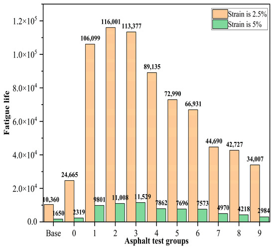 Based on the continuous viscoelastic damage model (VECD), Figure 7 shows the fatigue life of different bitumen at strain levels of 2.5% and 5%. In general, the fatigue life decreases with increasing strain levels. It is noteworthy that the additive-free asphalt (0) has the smallest fatigue life, which may be attributed to the fact that EVA and DRP do not form a proper crosslinked network structure in the bitumen, resulting in insufficient stiffness and ductility and weak resistance to fatigue damage [17]. By adding FEO to asphalt and changing the ratio of the four components, the rubber powder and EVA in the asphalt completely absorbed, dissolved, and dispersed uniformly, avoiding the phenomenon of lumps and agglomerates. This effect also promotes DCP and sulfur in the asphalt in line with the modifier to ensure a good crosslinking effect, involving the formation of a crosslinked mesh structure, thus improving the fatigue resistance. A silane coupling agent, KH-550, increases the degree of adhesion between the modifier and asphalt through coupling and also improves the fatigue resistance of asphalt to a certain extent. Interestingly, the fatigue performance of FEO-enhanced binders is not absolute, as can be clearly seen in Figure 7, where the fatigue life of asphalt modified with 3.4% FEO is less than about half of the fatigue life of asphalt modified with 2.6% FEO. In conclusion, FEO is mainly an aromatic component in MA, and its excessive content will cause the excessive softening of asphalt, reducing the deformation resistance and negatively affecting the fatigue performance.