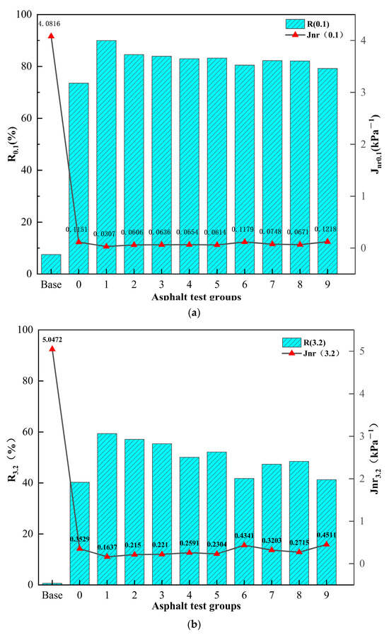 (a) Jnr and R values for the asphalt experimental group at a stress level of 30.1 kPa; (b) Jnr and R values for the asphalt experimental group at a stress level of 3.2 kPa.