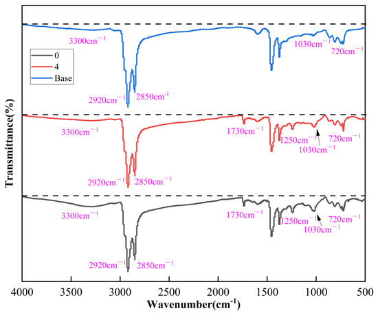 Figure 9 shows the infrared spectra of three different asphalts (matrix asphalt, additive-free asphalt (0), and DR/EVACMA (4)) in the wavelength range of 400 cm−1 to 4000 cm−1.