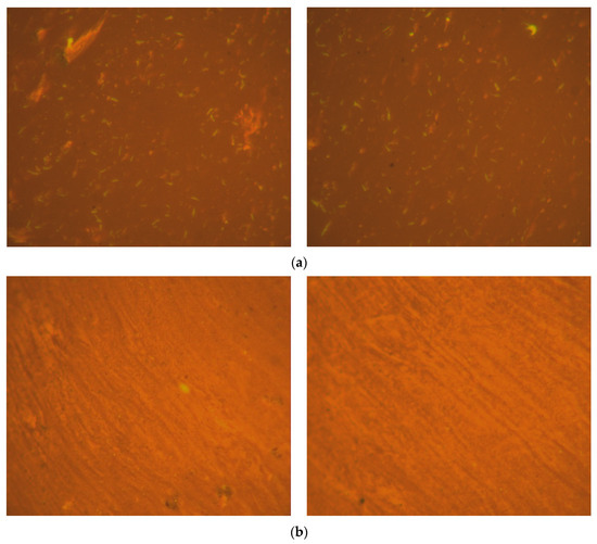 Fluorescence charts of asphalt at 400×. (a) Additive-free asphalt; (b) DR/EVACMA.