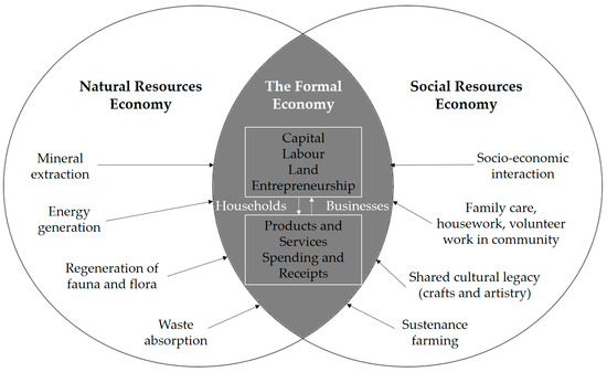 What these theories have in common is their emphasis on “regenerative economics”. This is largely encapsulated in the vision for a green economy. Essentially, economics is defined as the study of how resources are distributed/managed. Conventional economic thinking orbits around economic growth. If the economy is growing, there is progress. With the new emphasis on the green economy, the accent is shifting from quantity (of economic activity, i.e., money changing hands) to quality of (human) life. It restores a much-needed balance in the economy. As Figure 1 shows, the formal economy is seen in the broader context of social and environmental resources where human capital and natural capital are balanced with financial capital (and not seen as externalities).