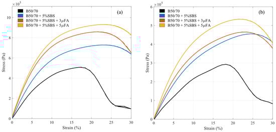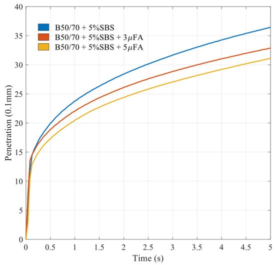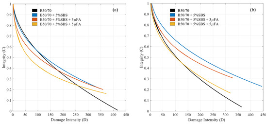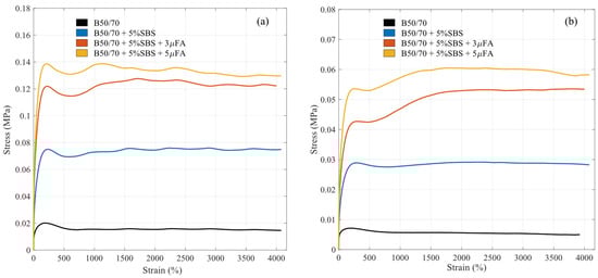 - Based on the rheological tests, adding mFA micro-filler significantly improves the stiffness |G*| of SBS binders in the LVE range. However, the incorporation of mFA does not generate a noticeable impact on d, which shows that its incorporation generates mainly a physical and not a chemical contribution. Concerning the MSCR test, mFA reduces all the test temperatures for creep and recovery phenomena, performing better against permanent deformation and cupping. Based on the VECD simulation, mFA does not significantly affect sample integrity with increasing damage intensity. In this sense, binders with mFA only achieve better C integrity for high damage intensities (D = 176) than the base binder. Concerning the BYET test, the samples with mFA caused an increase in stress after reaching the first maximum stress at 25 °C. The authors hypothesize that this behavior is due to a higher displacement of the binder in the torque caused by the DSR. Thereby, the mFA particles provide extra stiffness, which could be defined as a reserve of the material.