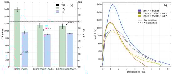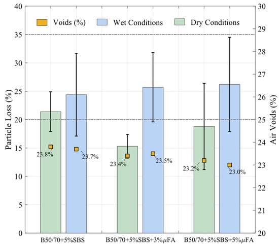- Based on the results of the PA16 porous mixes, adding mFA to the SBS-modified binder slightly reduces the percentage of voids in the sample (22.45%). This behavior is because the samples with mFA produce a binder with a thicker film, generating a higher bulk density and less binder runoff. Regarding abrasion resistance, it is concluded that all the samples meet the requirements in dry and wet conditions. However, the samples incorporating mFA in wet conditions achieve a higher particle loss with increasing concentration. In contrast, none of the PA samples meet the water sensitivity requirement. However, the addition of mFA manages to decrease the difference between dry and wet ITS. In the dry state, the samples with micro-filler reduce the FE and PE energy due to higher cracking before failure and faster propagation after failure. In the wet state, the mFA samples increase the FE and PE energy due to higher ductility.