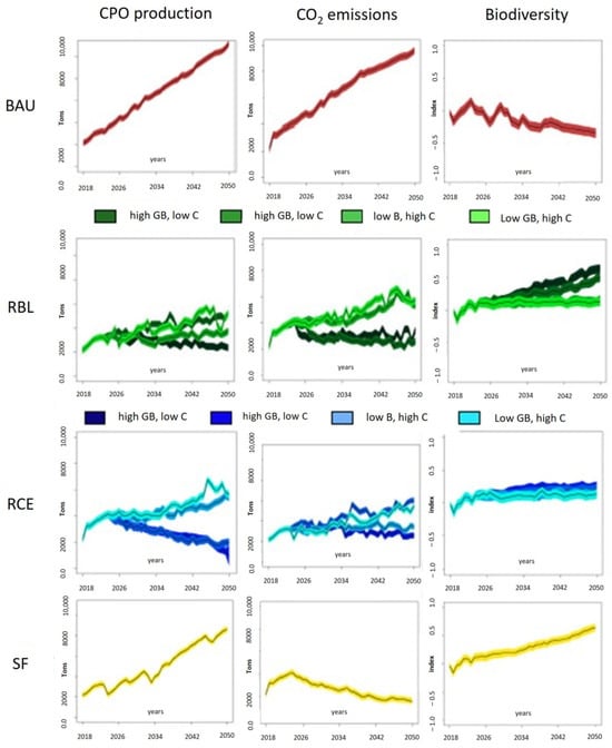 | Sustainable Futures (SF) | Supported by international organizations and developed nations, the government strives to establish mutually beneficial outcomes for both climate change mitigation and biodiversity conservation. The restoration of degraded land is undertaken in areas with varying degrees of degradation, benefiting biodiversity and carbon preservation. Additionally, companies utilize credits and public funding to improve production to enhance production efficiency in existing cultivations and initiate plantations in degraded lands. |