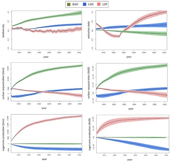 | Land Sharing (LSH): “Multifunctional landscapes” | Under the guidance of the Queensland and Australian Governments, there is a strategic shift toward more multifunctional discourses and governance frameworks in the Wet Tropics NRM Region. This transition prioritizes wildlife-friendly farming practices, albeit at the cost of reduced sugarcane yields. Consequently, the trends observed in the Wet Tropics NRM Region diverge from those in the LSP scenario. Here, both protected areas and sugarcane lands experience a reduction, making room for the expansion of semi-natural areas, with a particular emphasis on production forestry. This reflects a deliberate effort to balance conservation objectives with sustainable land use practices. |