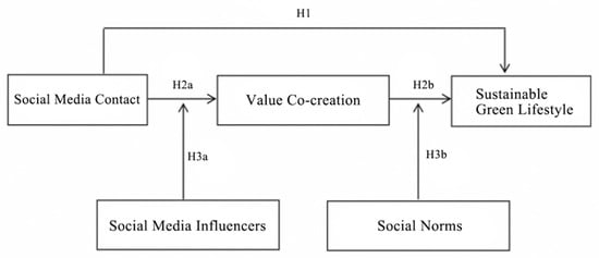 Although prior research has highlighted the importance of social media in promotion and communication, a comprehensive framework to clarify how to use social media as a value co-creation platform to promote a green lifestyle has yet to be developed. This research aims to create and test a conceptual model for using social media as a value co-creation platform to encourage and motivate people to adopt a sustainable green lifestyle, besides mapping the process of green lifestyle adoption from the actual social media user behaviors. Two hundred and eighty-nine (289) subjects participated in an online survey in the first half of 2022, and the data collected have been analyzed using regression. The three key findings: (1) social media contact is positively associated with a sustainable green lifestyle (β = 0.234, p < 0.001); (2) value co-creation partially mediates the relationship between social media contact and a sustainable green lifestyle (indirect effect = 0.113, with Sobel test’s t-value = 5.762); and (3) surprisingly, the moderating role of social media influencers and social norms in the social media contact–sustainable green lifestyle relationship is not supported. In addition, this research supplied some reasonable and practical implementations that can help green agents and policymakers promote green behaviors.