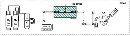 In this study, a fixed-bed reactor was used for the Cl2 adsorption experiments. A schematic of the apparatus is shown in Figure 2. The reactor utilized a 1/2-inch diameter quartz tube, and the temperature inside the reactor was controlled using a Proportional–integral–derivative (PID) controller and a Chromel–Alumel thermocouple sensor. The reactor was placed in an electric furnace at atmospheric pressure. The Cl2 adsorption reaction was conducted at a furnace temperature of 350 °C until the breakthrough point, using a gas flow of 100 mL/min (Cl2 100 ppm and N2 balance). The flow was regulated using a Mass Flow Controller (MFC, Brooks, AB, Canada, 5859E). All experiments used 0.3 g of red mud adsorbent, and ceramic wool was used to fix the catalyst layer within the reactor. During the experiments, any Cl2 gas that passed through the sorbent was dissolved in 500 mL of distilled water. The amount of Cl2 dissolved in distilled water was measured to compare the Cl2 adsorption performance of the adsorbents. Ion Chromatography (IC) is a type of liquid chromatography that separates ionizable samples dissolved in water using an ion exchange column. However, IC is costly due to its inability for real-time measurement and the need for manual sample collection with a per-sample analysis fee. To overcome these drawbacks, an ion sensor (AT-500) was used for real-time measurement of Cl content in the solution. This was five times cheaper than IC equipment, allowing for more economical experiments. The outlet gases from the reactor were analyzed automatically every 1 min using an ion sensor equipped with an autosampler. Figure S1 presents the results of a blank experiment conducted to verify the correlation between the Ion Chromatograph analysis and the real-time measurement device.