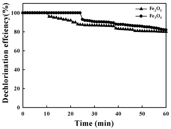 The dechlorination capacity was conducted to compare the Cl2 adsorption performance depending on the iron oxide phases. Figure 3 exhibits the dechlorination capacity of Fe2O3 and Fe3O4 in the presence of 100 ppm Cl2 at 350 °C for 60 min. The dechlorination efficiency of Fe2O3 is almost 100% during the 11 min with an adsorption capacity of 1.06 mgCl2/g and then slowly decreases to 81% at the time of 11–60 min. In contrast, the dechlorination efficiency of Fe3O4 shows 100% for the 25 min with an adsorption capacity of 2.65 mgCl2/g and decreases to 82% in the time range of 25–60 min. The Fe3O4 phase showed more than twice the Cl2 adsorption capacity compared to the Fe2O3 phase. These results suggest that the Fe3O4 phase has a more critical influence on the dechlorination capacity than the Fe2O3 phase.