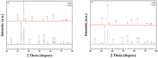 The physicochemical properties of H2-treated red muds were analyzed. As listed in Table 1, the BET surface area, pore volume, and average pore size of RM were 37.8 m2/g, 0.22 cm3/g, and 3.82 nm, respectively. In general, heat treatment reduces the specific surface area of red mud []. However, in the case of heat treatment using H2, there is no significant change in specific surface area, pore volume, and average pore size. It might be that the specific surface area is maintained as some of the Fe2O3 is reduced during the H2 treatment process.