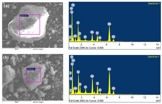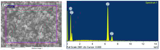 Figure 4 shows the XRD patterns of iron oxide in fresh and after Cl2 adsorption. The peaks of Fe2O3 (JCPDS No. 89–8103) and Fe3O4 (JCPDS No. 75–0449) were observed in the fresh state. After Cl2 adsorption, the peak of iron oxide remained and the iron chloride phase did not appear. It might be difficult to observe the phase change of iron oxide after Cl2 adsorption under the conditions of this experiment. In addition, the dechlorination effects of the iron oxide phases are confirmed by the SEM−EDS results in Figure 5. It revealed that while no Cl ions were adsorbed on Fe2O3, 0.3 wt% of Cl ions were observed on Fe3O4. This confirms that the Cl2 adsorption capacity varies with the structural form of iron oxide. Since the red mud component is mainly formed in the Fe2O3 structure, it is necessary to investigate the effect of Cl2 gas adsorption capacity according to H2 treatment.