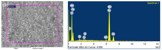 Figure 9 shows the XRD patterns of red mud with various H2 treatment temperatures after Cl2 adsorption. In the case of TiO2 and SiO2 peaks in all samples, no change was observed even after the Cl2 adsorption experiment. Therefore, it is judged that the TiO2 and SiO2 structures have no effect on Cl2 adsorption. The peak of Ca2Al2SiO7 (JCPDS No. 35–0755), Ca(ClO3)2 (JCPDS No. 01–0716), and NaClO3 (JCPDS No. 73–0145) was observed in red mud without H2 treatment after Cl2 adsorption. In the case of H2-treated red mud, the NaClO3 peak was relatively small after the Cl2 adsorption reaction, and it was confirmed that the Ca(ClO3)2 peak mainly increased. As the temperature of the H2 treatment process increases, the Na2CO3 structure relatively decreases because CO2 is desorbed, and the stable CaCO3 structure increases at high temperatures, so it is assumed that the Ca(ClO3)2 peak relatively increases after Cl2 adsorption. However, as shown in Figure 7, at the H2 treatment temperature of 700 °C, CO2 in the CaCO3 structure was desorbed and the CaCO3 peak almost disappeared, resulting in a tendency for the Ca(ClO3)2 peak to decrease after Cl2 adsorption. These results indicate that the presence of Na and Ca in the elemental composition has a decisive influence on the dechlorination capacity of the red mud. For the H2-treated red mud above 550 °C, the Fe3O4 peak relatively decreased and the FeCl3 peak was confirmed after the Cl2 adsorption, which is believed to have changed the Fe3O4 structure to the FeCl3 structure during the Cl2 adsorption. After Cl2 adsorption (Figure 10), the SEM-EDS analysis results showed that the Cl ion concentration was approximately 0.26% for the red mud without H2 treatment, and for the red mud with H2 treatment at 700 °C, the Cl ion concentration was confirmed to be 0.61%. Although the Na8(AlSiO4)6(CO3) structure was relatively reduced by the H2 treatment, when the Fe2O3 structure was converted to the Fe3O4 structure, it was relatively suitable for adsorbing Cl2.