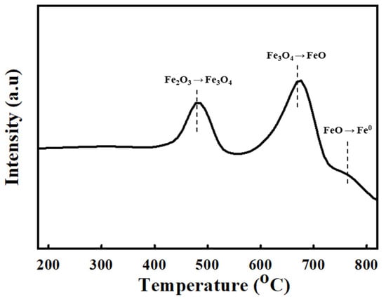 Figure 6 shows the H2-TPR profiles of the red mud under 10% H2 at a temperature range from 30 °C to 850 °C with a temperature ramp rate of 10 °C/min after pretreatment with N2 at 200 °C for 1 h. The H2-TPR curve of the red mud displayed two peaks at 430–520 °C and 630–800 °C, which are ascribed to the reduction in different iron oxides. The peak between 430 °C and 520 °C can be assigned to the reduction from Fe2O3 to Fe3O4, and the high-temperature peaks at 630–800 °C correspond to the reduction from Fe3O4 to FeO and included FeO to Fe metal [,,]. Based on H2-TPR analysis, the H2 treatment temperature was set to 400 °C, 550 °C, and 700 °C to control the Fe oxide phase on red mud.