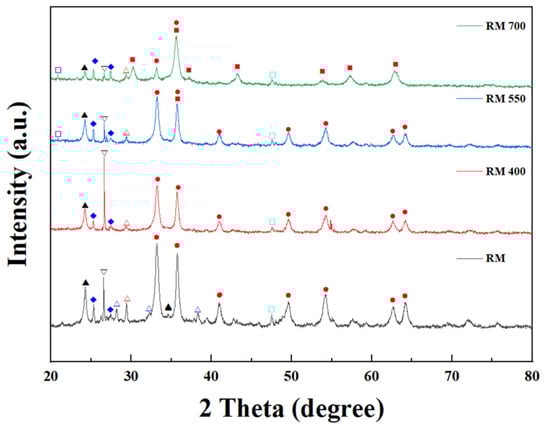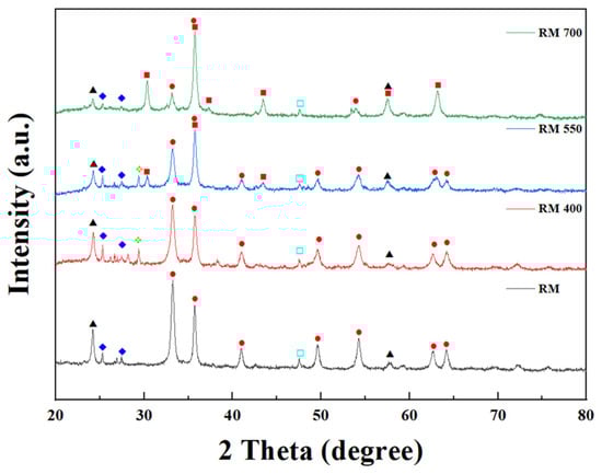 XRD patterns of RM, RM 400, RM 550 and RM 700: (●) Fe2O3, (■) Fe3O4, (❖) CaCO3, (◆) TiO2, (□) SiO2, (▲) Na8(AlSiO4)6(CO3).