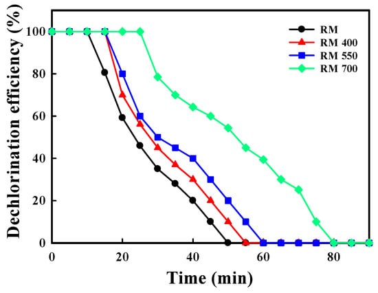 The dechlorination capacity of RM, RM 400, RM 550, and RM 700 in the presence of 100 ppm Cl2 at 350 °C.