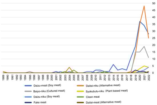 To examine how alternative meat is referred to in the mass media, we conducted a survey of terms that appeared in newspaper articles [30]. The newspapers surveyed were Yomiuri, Asahi, and Mainichi, which together account for 82.3% of the total newspaper circulation in Japan (average from July to December 2021, [31]). The period covered by the survey was the period available in each company’s database (Asahi: 1879 to 17 June 2022; Yomiuri: 1874 to 17 June 2022; Mainichi: 1872 to 17 June 2022). The 17 terms used in the search were extracted from two Japanese books on meat substitutes [32,33].