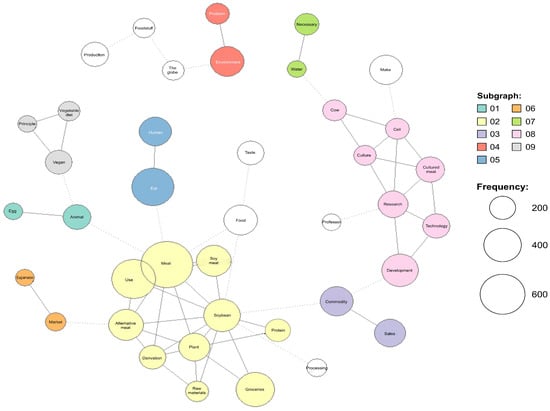 Furthermore, we analyzed the three words “Daizu meat (soy meat)”, “Daitai-niku (meat substitute)”, and “Baiyo-niku (cultured meat)” that appeared at the top of the list using KHCoder [35], which is a tool to draw a network of words with similar occurrence patterns, i.e., words with a strong degree of co-occurrence, connected by lines. The textual data were gathered and analyzed in Japanese using a KH coder (see Appendix A). English translation is attached to the results of analysis. We visualized word relationships for 390 collected articles by co-occurrence network command, and confirmed that “soybean meat” and “alternative meat” were the words with the strongest degree of co-occurrence. The terms “soy meat” and “meat substitute” were found to occur frequently together. Since 2018, “soybean meat”, which has been commercially available for a considerable period, has also been referred to as “alternative meat”, thereby increasing its market presence. In the co-occurrence network for “alternative meat”, words such as “vegetarian” and “vegan” were found, but not words related to Japanese food culture and history, such as “vegetarian cuisine” (Figure 2).
