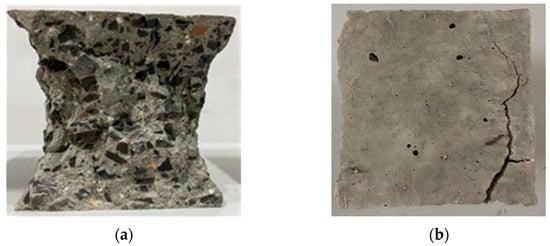 The freeze–thaw cycles of LWHSC were subjected to optical observation. After 25 freeze–thawing cycles, the SY1 and SY4 specimens exhibited intactness without any visible epidermal detachment. After 75 cycles, observable epidermis shedding and the initiation of hemp surface changes were noted. Upon reaching 125 cycles, a substantial area of epidermis shedding and pronounced hemp surface alterations led to the exposure of coarse aggregates. After 150 cycles, the SY1 specimen was broken and the test was finished, while the SY4 specimen only manifested as aggregate shedding and the surface was marked by multiple “pits”.