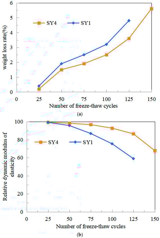Figure 5 represents the weight loss rate and relative dynamic modulus of the elasticity of LWHSC after rapid freeze–thaw cycles. It can be seen from Figure 4 that, after 125 freeze–thaw cycles, the SY1 and SY4 specimens have a weight loss of 4.8% and 3.6%, and relative dynamic modulus of elasticity reduction of 41.1% and 15.6%, respectively. These findings suggest superior freeze–thaw resistance in the SY4 specimen relative to SY1. Table 7 shows that the SY4 specimen boasted elevated cementitious materials (cement, fly ash, and slag powder) while sharing the same aggregate composition (sand, clay, and shale ceramsite with SY1. From this, it can be deduced that an increase in cementitious material potentially enhances the freeze–thaw resistance of LWHSC to some extent. This augmentation can be rationalized through the lens of concrete freeze–thaw failure mechanisms, wherein microcracks form on LWHSC pore walls under the combined pressure of ice expansion and unfrozen water osmotic pressure. The elevated cementitious content effectively counters this expansion and osmotic pressure, thereby amplifying freeze–thaw resistance. This implies that the freeze–thaw resistance of LWHSC diminishes with escalating proportions of shale and clay ceramsite lightweight aggregates.