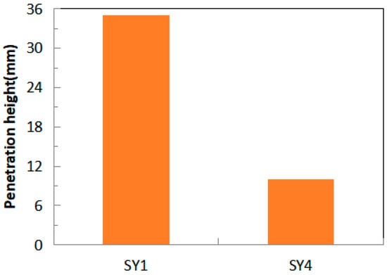 Figure 6 plots the water penetration depth of LWHSC. As is evident from Figure 6, the SY1 specimen exhibits deficient water penetration performance, manifesting a penetration depth of 35 mm. In contrast, the SY4 specimen displays a relatively limited water penetration depth. Water penetration is primarily governed by diffusion and intricately tied to concrete porosity. Diminished porosity results in a reduced water diffusion coefficient. Notably, an increased cementitious content translates to decreased porosity. Therefore, the increase in the cementitious material of LWHSC engenders an enhanced water penetration resistance. As a result, this effect leads to a reduction in water penetration depth.