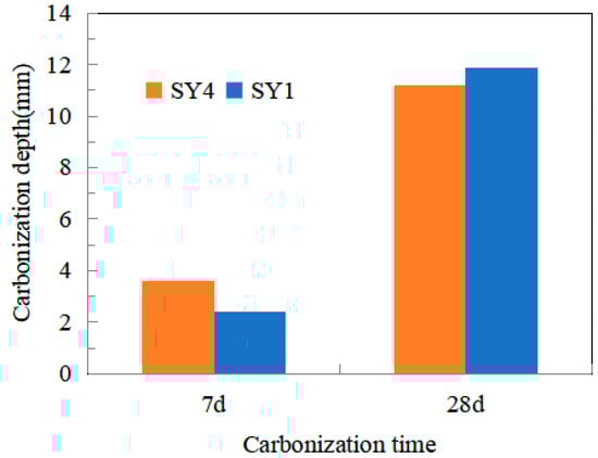 Figure 7 indicates the carbonization depth of LWHSC. As depicted, the carbonization depth of the SY1 and SY4 specimens are 2.4 mm and 3.6 mm at 7 d and 11.9 mm and 11.2 mm at 28 d, respectively. The 28-day carbonization depth of SY1 is greater than that of SY4. SY1 has a lower cementitious material than SY4, resulting in a higher proportion of aggregates. These findings indicate that the increase in cementitious material of LWHSC improves its carbonization resistance. This enhancement stems from the concrete carbonization mechanism, wherein a reduction in alkalinity occurs due to the reaction of gaseous CO2 with Ca(OH)2, forming the neutral product CaCO3. One of the main carbonization factors is the diffusion of CO2, which is determined by the concrete porosity. The low porosity results in a diminished diffusion coefficient of CO2. The increase in cementitious material in LWHSC augments its carbonization resistance, ultimately resulting in a reduced carbonization depth.
