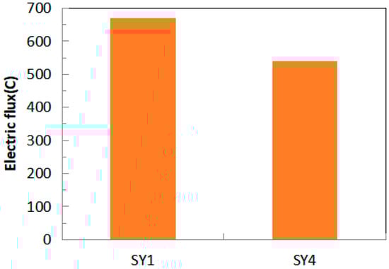 Figure 8 portrays the electric flux of LWHSC. A higher electric flux corresponds to diminished chloride penetration resistance. As illustrated in Figure 8, the electric flux values for the SY1 and SY4 specimens are 670C and 540C, respectively. It is inferred that heightened cementitious material within LWHSC could potentially enhance its resistance to chloride penetration. This behavior is rooted in the diffusion of chloride within concrete. An elevated cementitious material content yields reduced porosity, resulting in limited chloride diffusion, as evidenced by the lower electric flux values.