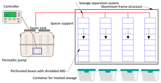 The raw wastewater used in this study came from a septic tank connected to the university building (Agricultural University of Krakow, Poland). The wastewater was directed to the septic tank for preliminary treatment. In Table 1, the qualitative values of pre-treated wastewater in the septic tank are given. In the next stage, the wastewater was pumped to the surface of a vertical biological filter.