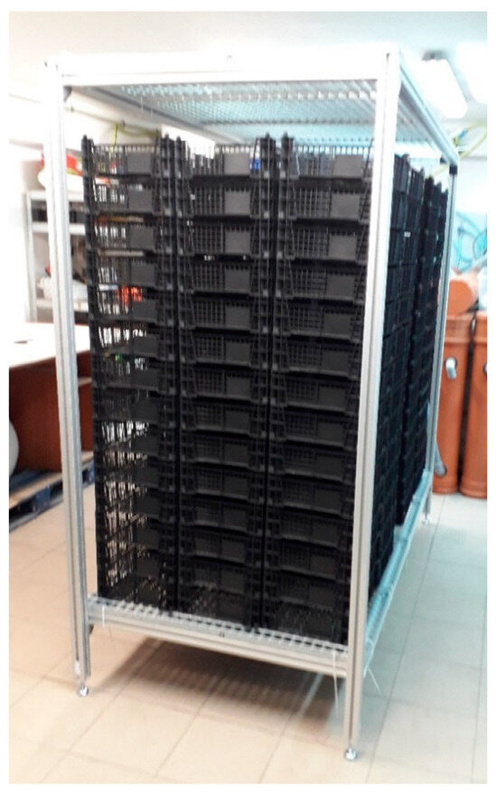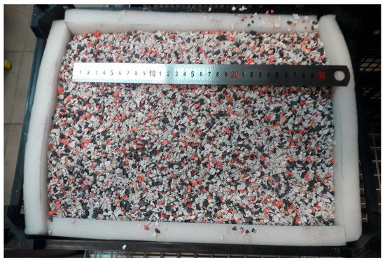 Two types of plastic materials were examined: one black, with particle sizes ranging from 0.2 to 1.0 cm, and the other light yellow, with particle sizes from 0.2 to 0.8 cm. Additionally, colored plastic derived from crushed PET (Polyethylene Terephthalate bottles) was utilized. The container was lined with a layer of PUR (polyurethane) foam and then filled with finely shredded e-waste material. The biological bed of the setup was filled with crushed ABS material from used waste of electrical and electronic equipment (WEEE) and used to fill containers measuring 30 × 40 cm with a height of 11 cm. Furthermore, three of the compartments incorporated a special layer made of shredded polyurethane foam (recycled plastic material). An example photo of the packing of the bed is shown in Figure 3. ABS with a density of 1.1 g/cm3 was used in the tests. The porosity of the ABS material was 45% (Figure 4). ABS (Acrylonitrile Butadiene Styrene) is a widely utilized plastic known for its robustness and longevity. Its environmental footprint is intricately tied to recycling practices, offering a sustainable approach by diminishing the demand for new materials and curbing waste. Appropriate recycling is pivotal for eco-friendly disposal since ABS has a slow biodegradation rate in landfills. Despite its petrochemical-based production, responsible disposal methods, especially recycling, can effectively temper its environmental impact. While ABS is inherently non-biodegradable, its overall influence on the environment hinges on disposal practices and the widespread adoption of recycling initiatives. Increased recycling of ABS contributes to resource conservation and eases the burden on waste management systems.