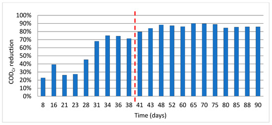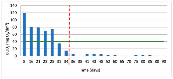 It took 38 days of operation in the biological reactor for the CODCr values to achieve a significant reduction to one fourth of their initial levels (Figure 7). During the initial weeks of the filter bed’s operation, CODCr reduction varied in the range of approximately 20–70%. It was only after 38 days of operation that a more stable reduction exceeding 80% was achieved (Figure 8). In another study involving shredded ABS, the most significant reduction in COD was noted with the sprayed loaded system. For BOD5 reduction, the highest efficacy was attained through the aeration system [25].