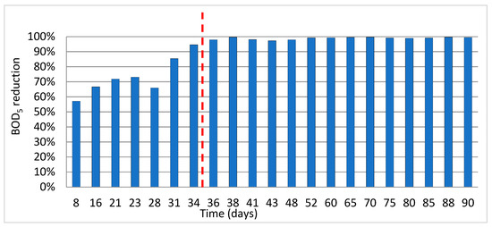 BOD5 reduction for the finer filter media, with the red dashed line indicating the moment of achieving the appropriate reduction.