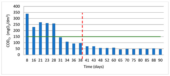 CODCr values for the finer filter media, with the red dashed line indicating the moment of achieving the appropriate value. The green line represents the permissible value.