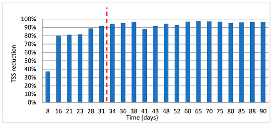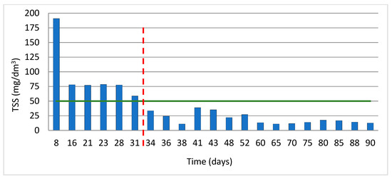 The CODCr:BOD5 ratio suggested effective removal of nitrogen compounds through advanced biological treatment of the wastewater [28]. During the four-month study, a filter filled with 0.5 V of polyurethane foam sponge waste proved highly stable and effective, achieving reductions averaging 87.8% for CODCr, 91.0% for BOD5, 80.0% for suspended solids. Additionally, poly(ethylene terephthalate) flakes exhibited comparable performance, with average CODCr and suspended solids reductions of 87.1% and 84.0%, respectively [29]. The CODCr/BOD5 ratio of 1.31 indicated that the incoming wastewater was highly biodegradable and relatively easy to treat. In simple terms, this means that the influent wastewater’s composition can be readily broken down through biological processes, making it a desirable characteristic for wastewater treatment [30]. The CODCr-to-BOD5 ratio helps gauge the balance between pollutants that can be chemically or biologically treated. A high ratio means more chemical treatment potential, while a low ratio indicates effective biological pollutant degradation. Wastewater facilities use this ratio to tailor treatment methods to the pollutants present in the water [31]. The TSS level in untreated municipal (raw) wastewater did not surpass 340 mg/dm3. TSS levels in the effluent after the septic tank reached a maximum of 689 mg/dm3 (Table 1), and reduction to the required norm took place between the 31st and 34th day of operation (Figure 10).