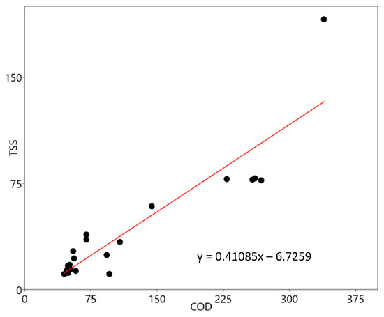 In the initial week, TSS levels were notably elevated, and it took over a month to achieve a satisfactory value which fell below 50 mg/dm3, complying with the established regulatory standard (Figure 9). Substantial TSS reduction was attained beginning in the second week of filter operation, with the required reduction, in line with regulatory standards, documented after 31 days (Figure 10). Based on the GLM and multivariate regression, the relationship between TSS and CODCr has been established (Figure 11). Substantial TSS reduction was attained beginning in the second week of filter operation, with the required reduction, in line with regulatory standards, documented after 31 days.
