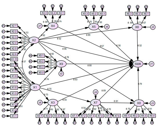 The model’s quality was evaluated using various goodness of fit (GOF) tests, including sig-probability, RMSEA, GFI, AGFI, CMIN/DF, TLI, and CFI, with the standardized criteria values listed in Table 4. The initial hypothesis posited that all latent variables (X1 to X9) significantly influence the application of SMSs in Pelra sea transportation, as depicted in Figure 3. However, the initial model test indicated that the GOF values did not meet the requisite criteria, necessitating modifications to the structural model. Subsequent tests and estimations involved altering paths between latent variables and manifest variables to optimize the model [16].