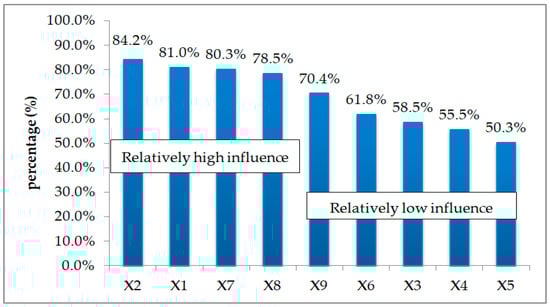 Furthermore, the estimated values indicate a hierarchy of influence among the factors affecting SMS application, ranked from the most to the least influential: crew responsibility and authority (X2), company responsibility and authority (X1), ship construction (X7), ship stability (X8), safety and navigation equipment (X9), ship maintenance (X6), resources and personnel (X3), emergency preparedness (X4), and finally, administration and documentation (X5). This order of influence is visually depicted in Figure 4.