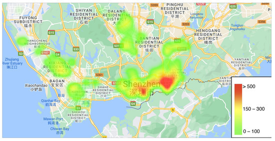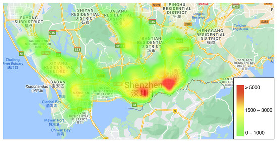 To begin with, the city of Shenzhen is divided into a grid system, resulting in a total of 633 grids. Subsequently, GPS travel data is collected from 27,204 electric taxis operating throughout Shenzhen over the course of a single day. This GPS data records both the pick-up and drop-off locations of passengers, as well as the corresponding travel time between these points. The drop-off locations are used to determine the charging demands for electric taxis [39,40]. By analyzing this data, the number of charging demands within each grid and the travel distances between different grids can be calculated. The distribution of charging demands is illustrated in Figure 2. We further narrow down the analysis to specific time periods within a day when the demand for charging is relatively higher in the identified areas. The arrival rate of EVs during relatively busy times at CS j can be obtained.
