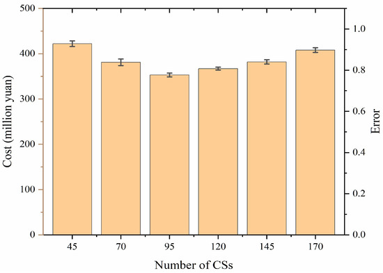 Figure 5 illustrates the social costs associated with different numbers of CSs. The bar in the figure represents the optimal value obtained by performing IQGA 20 times, while the error bar indicates the difference between the optimal and average values. The results reveal that an optimal number of CSs is required to minimize the social cost. Having too many or too few CSs leads to an increase in the social cost. Figure 6 presents the cost components for different numbers of CSs. It is evident that having too few CSs significantly raises the costs for EV users and carbon emissions, while an excess of CSs greatly increases the construction and operational costs for the CS operator. This demonstrates the importance of optimizing CSs from a holistic perspective, taking into account the social cost and balancing the costs among CS operators, EV users, and the environment.