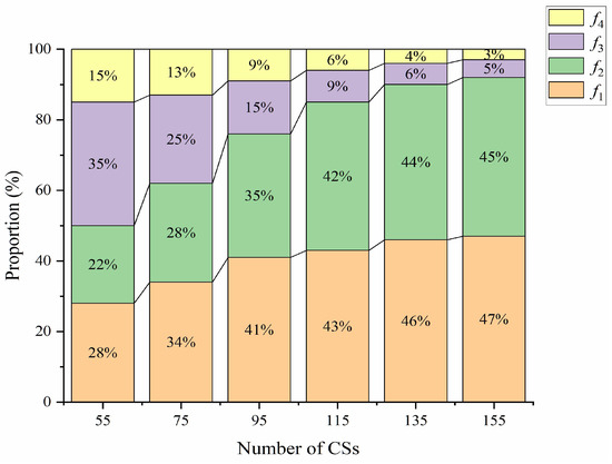 The impact of the number of CSs on carbon emissions was investigated and depicted in Figure 7. We have observed a consistent pattern where an increase in the number of CSs leads to a gradual reduction in carbon emissions. However, as the number of stations continues to grow, the rate of emission reduction begins to diminish. Particularly, when the number of CSs reaches a range of 135 to 195, the reduction in emissions becomes nearly linear. This trend can be attributed to the initial decline in carbon emissions resulting from the reduced proximity between EVs and CSs. However, as the CS distribution network expands further, the advantage of reduced traveling distances for EVs becomes less pronounced. When considering the environmental impact, it becomes crucial to take into account the diminishing marginal environmental benefits associated with the increasing number of CSs. It is imperative to carefully evaluate and select an optimal number of stations rather than pursuing uncontrolled expansion.