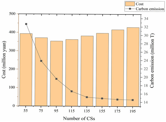Changes in costs and carbon emissions with the number of CSs increasing.
