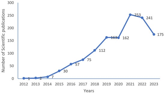 Figure 1 depicts the evolution of scientific articles from 2012 to 2023. Over the past 12 years, the number of articles has experienced significant growth, increasing from 7 in 2014 to 253 in 2021. A substantial proportion, approximately 87% of the articles, were published between 2018 and 2023.
