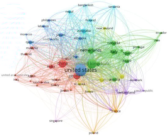 In the map produced, the size of each node is proportional to the number of articles published by a respective country. The connecting lines between these nodes represent collaborative links between countries, with the thickness of these lines varying to reflect the degree of collaboration. Additionally, the map features colored clusters, which visually depict the primary groups involved in collaborative efforts.