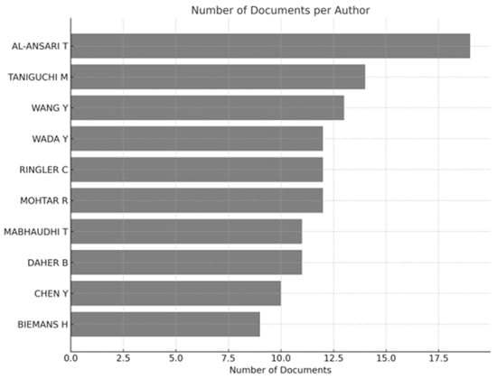 Considering the interdisciplinary nature of WEF nexus research and its results, the significance of authors is evaluated not just by the sheer number of their publications, but also through their local productivity. This is determined by tracking citations within the analyzed database, indicating instances where an author’s work has been referenced by others in the same dataset. An analysis of these publications, as depicted in Figure 6, reveals a diverse distribution of author rankings, which varies both geographically and across various disciplines. Tareq-Al Ansari (h-index = 44) is the most productive author in terms of publications, with a technical research interest in energy systems and energy-water-food nexus aimed to address food insecurity, mainly focusing on the Middle East. In second place, Makoto Taniguchi (h-index = 56), with a background of hydrology and land–ocean interaction studies, addressed methods of the WEF nexus in addition to the inclusion of groundwater systems. His scale of work varied between global applications and studies between Japan and USA. Yaoping Wang (h-index = 13), with a research interest in ecohydrology, climate change, and water resources, contributed to different applications of the nexus on the urban scale in terms of water security, optimization methods, and soil studies. Claudia Ringler (h-index = 79), Yoshihide Wada (h-index = 96), and Rabi Mohtar (h-index = 40) share the same number of publications in fourth place, with research interest focusing on agriculture and development, hydrology and system science, and WEF security relationship with policies, respectively. As a result, preliminary findings suggest that the research conducted on the WEF nexus is distributed throughout a range of scientific fields and geographic areas, indicating the need for more evaluation of the authors’ interactions.