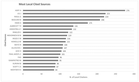On a first level, this is represented by the local citation results (Figure 7). These results help identify both H. Hoff and J. Liu as the most cited sources, despite not being the most productive recently. This highlights the ongoing importance of the initial WEF nexus concept proposed by Hoff, while recent researchers aim for a methodological and case-based development.