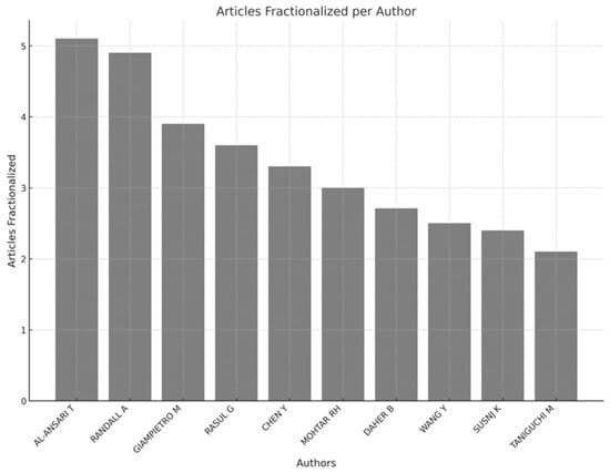 Another interesting aspect is presented in the fractionalized author’s frequency distribution, where we refer to the distribution of the number of publications by individual authors in the dataset. The fractionalized index of the top 10 writers is found to be greater than 1, indicating a noteworthy level of collaboration among these authors. In addition, it is possible to infer the contribution of several researchers like Mario Giampietro, and Alan Randall (Figure 8).