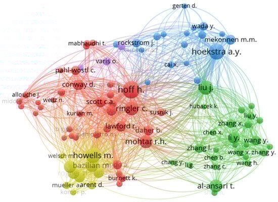 In an effort to explore the relationships between the writers in greater detail, Figure 9 illustrates these connections visually. A minimum of five publications by the author were chosen. The map illustrates how the most prolific writers on the WEF nexus are split up into four groups, all of which are affiliated with the same institutional entities. In a similar vein, cross-authorships across national and institutional borders are illustrated.