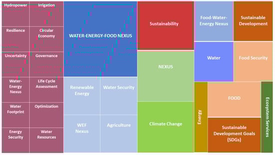 The term “WEF Nexus” appeared most frequently (142), followed by “sustainability” (106), nexus approach (97), “Climate Change” (94), “Food-water-energy Nexus” (67), “sustainable development” (63), “water” (57), “energy” (51), “food” (44), SDG (41), and “ecosystems services” (37) (Figure 10). It is worth noting that “WEF Nexus” remains the strongest identifier for this discipline, followed by “Climate”, “Nexus”, and “Sustainability”. Nexus identifiers are also disciplinary focus of “Water”, “Energy”, and “Food”. “Sustainable Development Goals” is another effective designation. This shows that the SDGs are the ultimate nexus, and there appears to be an increasing tendency toward this as well.