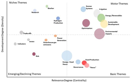 As previously highlighted, several facets of the nexus research make a detailed analysis on methodologies impractical and irrelevant, if a prior thematic analysis is not performed where the bigger picture of themes and ideas are captured. Hence, the thematic analysis aims to identify four categories of themes: basic, emerging, driving, and highly developed and isolated [14]. Looking at the emerging themes (Figure 11), socio-ecological systems are frequently represented within the nexus by terms like “humans”, “environmental impact”, and “ sustainable development”. The latter term, despite being the initial goal of nexus scholarship, has only recently gained explicit mentioning in the studies. This analysis is further expanded to show conceptual maps of sub-terms relevant to each cluster under each topic. Systems sciences and socio-ecological sciences are integrated into these topics. A clear dominance of the water–energy nexus is still noted. We note here the strong presence of “Energy”, as it is represented in several entries including, “Energy”, “Hydrogen Production”, “Energy Food Nexus”, and “Biochar”. It is expected that the word “Tradeoff” is more represented as a lot of the nexus activities are all related to trade-offs.
